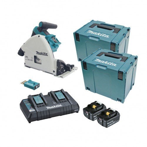 Makita 18Vx2 BRUSHLESS AWS 165mm Plunge Saw Kit - Includes 2 x 5.0Ah Batteries, Dual Port Rapid Charger & 2 x MakPac Case DSP601PT2JU