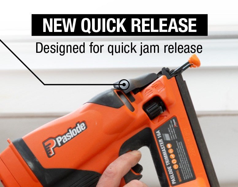The Paslode Impulse TrimMaster Angled Bradder Nail Gun is powerful and designed for Australian conditions. These Paslode brad guns have a great nose design allowing for quick jam release and a body design which is contoured to improve nail line of sight and handling. Along with this, the Paslode TrimMaster has been redesigned for improved durability and features Paslode’s fuel delivery system which provides consistent power across wider range of temperatures.