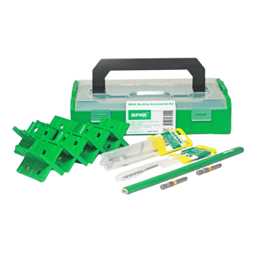 The SPAX decking screw accessory kit is a must when undertaking any decking project. It includes two SPAX T-STAR plus T25 driver bits 50mm long, six SPAX deck board spacers, a SPAX pencil, a SPAX hardwood step-drill, and a replacement drill-bit.