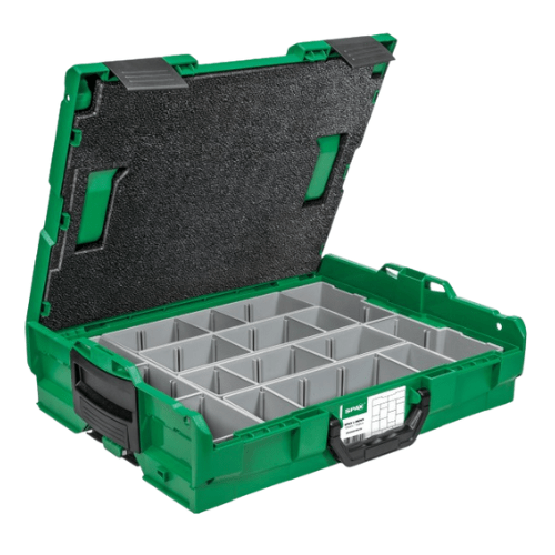 This L-Boxx tool organizer features a side locking mechanism that allows it to be stacked together for easy transport and storage.